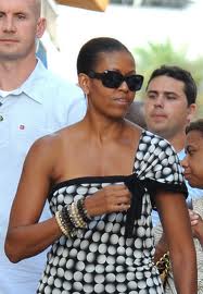Guess she’s taking a fashion vacation as well. So much for decorum of the First Lady. Why doesn’t she just break out the Aunt Jemima African getup? We all know she’s not proud of America and just dying to express her roots