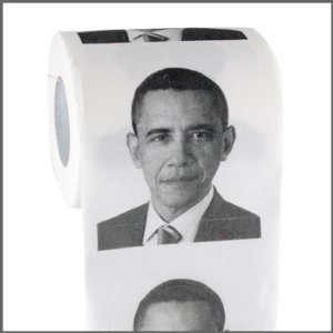 | Barack Obama Toilet Paper Rollwill transform Barack Obama from the 44th President to the #2 President! A political gift that will wipe ’em up in your next debate! Each roll contains 200 sheets of 3-ply toilet paper. $5 per roll. Available at Amazon .com |