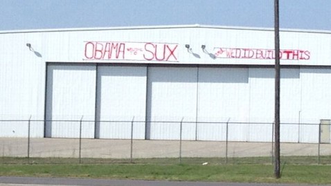 Greeting Air Force One as it touched down under sunny skies and sultry heat was a hand-painted banner draped across the top of an airplane hangar that reads, “Obama Welcome to SUX – We Did Build This.” “SUX” is the airport code for Sioux City. |