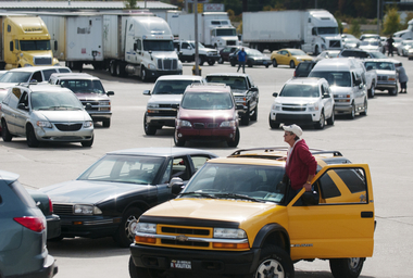 | Hundreds wait for $1.84 per gallon gas during the Americans for Prosperity-Michigan’s ‘Obama’s Failing Agenda’ bus tour on Monday at the Beacon & Bridge gas station in Mt. Morris Township. The price roll back was where the group said reflects the cost of gas in 2008, before President Barack Obama took office.