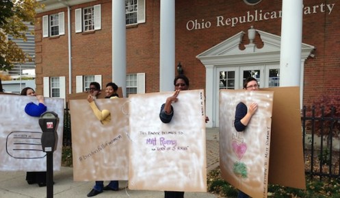 So the other morning a reader e-mails me a picture of a handful of women demonstrating outside the headquarters of the Ohio Republican party — in what we expert analysts round about this point in the quadrennial election cycle like to call the critical battleground of the Buckeye State. The women each wore two giant pieces of cardboard, front and back: