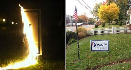 Libby Stevens put up her 4-foot-by-8-foot blue and white Mitt Romney sign when the candidate himself came to Leesburg last week. It was on her front lawn, inside her white picket fence. About 2 a.m. Monday someone set the plastic sign on fire.