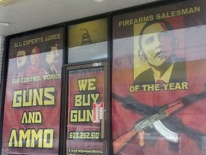 | The gun shop, Collectable Arms & Ammo, is located in Merrimack, N.H. and the owner is not apologizing for the display…http://www.theblaze.com/stories/2013/03/01/president-obama-awarded-firearms-salesman-of-the-year-award-by-new-hampshire-gun-shop/ |