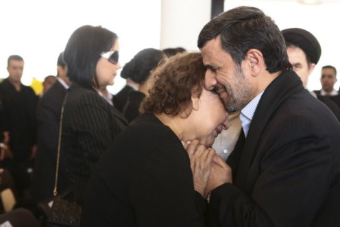 The photo, released by Venezuela’s Miraflores Press Office, shows Elena Frías’ right hand clutching Ahmadinejad’s left, her head against his, as they stand near the flag-draped coffin of her son at a military academy in Caracas, Venezuela, on Friday.