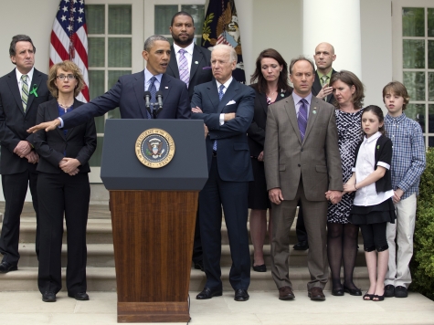 On Wednesday afternoon, Obama played his part to perfection. Mark Barden, father of a first-grader murdered in Newtown, introduced him. Flanking Obama were other Newtown victims; Vice President Joe Biden, face creased in supposed emotional agony, his arm around the mother of a Sandy Hook victim; and former Congresswoman Gabby Giffords, who has been one of the lead advocate for gun control on behalf of the administration.