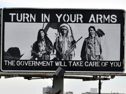 What’s wrong with this ad?There are two gun-rights billboards in Greeley, Colorado depicting a black-and-white image of three American Indians (or Native Americans, if you prefer politically correct terminology). Below the picture are the words, “Turn in your arms. The government will take care of you.” As is to be expected from the mainstream media, this Yahoo News article and accompanying video only quotes or shows those who are disgusted, and believe that the ads are offensive, insensitive, and make light of atrocities the federal government committed. If the left gets their way, in a day or two, we can expect the racist perpetrators to be This is political correctness and over-sensitivity run amuck. Would Jews get offended at hypothetical ads for the Holocaust Museum showing images of Jews in Nazi concentration camps? Would they be tormented by an anti-Nazi or anti-hate ad showing the same images? Probably not. They are offended at silly PETA ads comparing the killing of Jews to the killing of chickens. But the Greeley ad is making a serious point about giving the federal government too much power and rendering citizens defenseless by taking away their guns. If anything, it makes the government look bad. Whether you agree or disagree with the message, there is nothing derogatory to American Indians here. http://www.americanthinker.com/blog/2013/05/whats_wrong_with_this_ad.html |