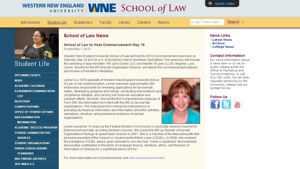 IRS Department’s Lois Lerner to Receive Award at College Commencement on May 18 for, according to the University, “Praised Her for Enhancing Transparency and Promoting Good Government Ethics at the IRS.”
